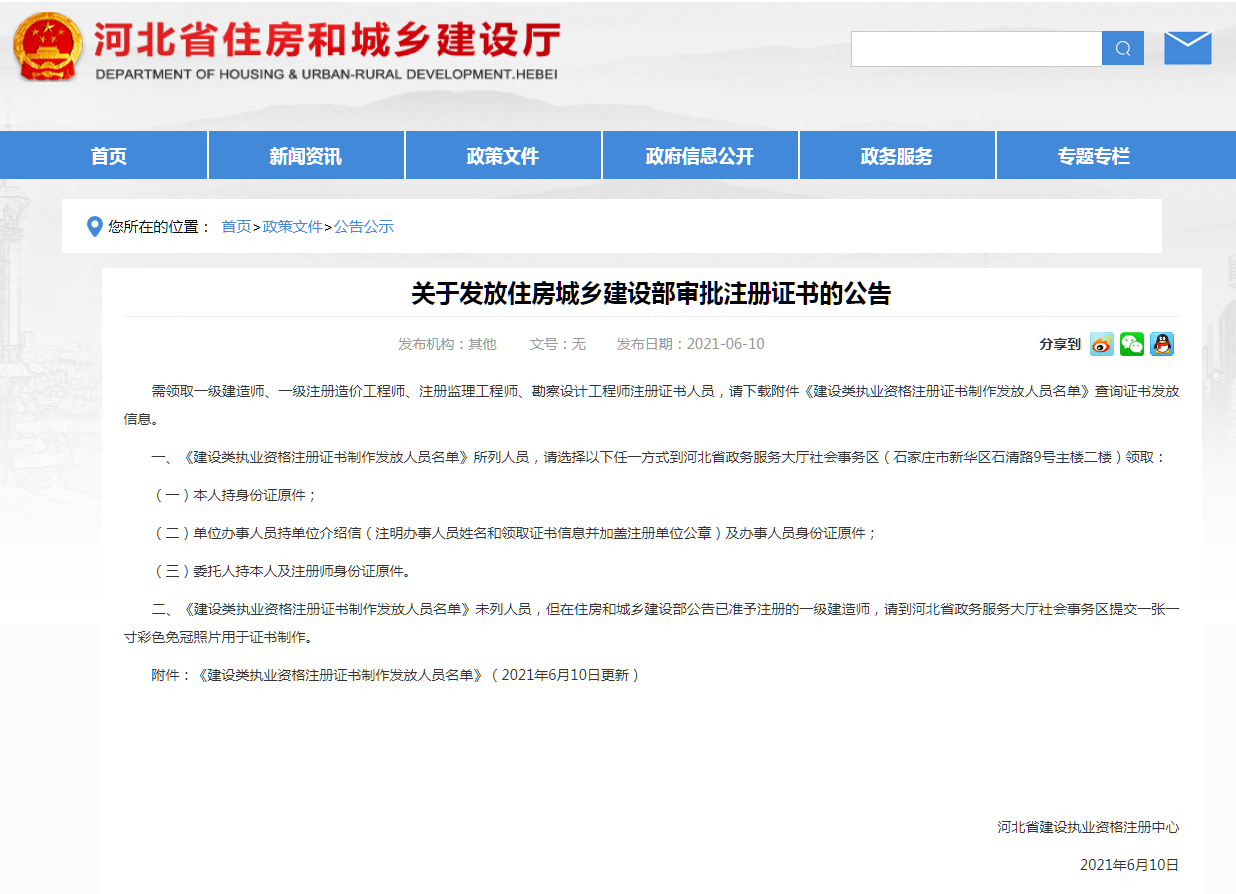 昨日河北住建廳發布:關于發放住房城鄉建設部審批注冊證書的公告