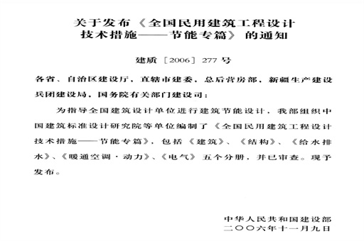 《全國民用建筑工程設計技術措施--節能專篇》(2007)是由建設部工程質量安全監督與行業發展司組織中國建筑標準設計研究院等單位編制的一套以指導全國建筑設計單位進行建筑節能設計的技術文件,是對《全國民用建筑工程設計技術措施》(2003)節能設計部分內容的補充、深化、匯總和完善,是節能設計標準的細化與延伸。《全國民用建筑工程設計技術措施--節能專篇》(2007)包括《建筑》、《結構》、《給水排水》、《暖通空調--動力》、《電氣》五個分冊,內容基本涵蓋目前可應用于工程建設節能技術的全部內容。