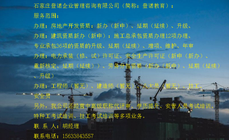 登諾(www.sjzdenguo.com)-河北省石家莊專業(yè)的建筑資質(zhì)代辦服務(wù)平臺(tái),專注資質(zhì)代辦,建筑工程資質(zhì)辦理,企業(yè)資質(zhì)代理等,另外,我公司還經(jīng)營中高級(jí)職稱評(píng)審、安全生產(chǎn)許可證辦理、學(xué)歷提升、安管人員考試培訓(xùn)、特種工考試培訓(xùn)、技工考試培訓(xùn)等多項(xiàng)業(yè)務(wù)。