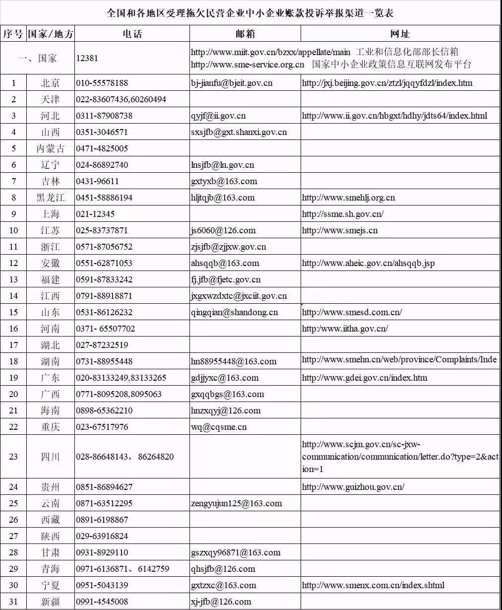 拖欠民營企業(yè)、中小企業(yè)賬款的投訴舉報渠道見下表。可通過電話、郵箱舉報,或打開相應網(wǎng)站進行在線投訴。